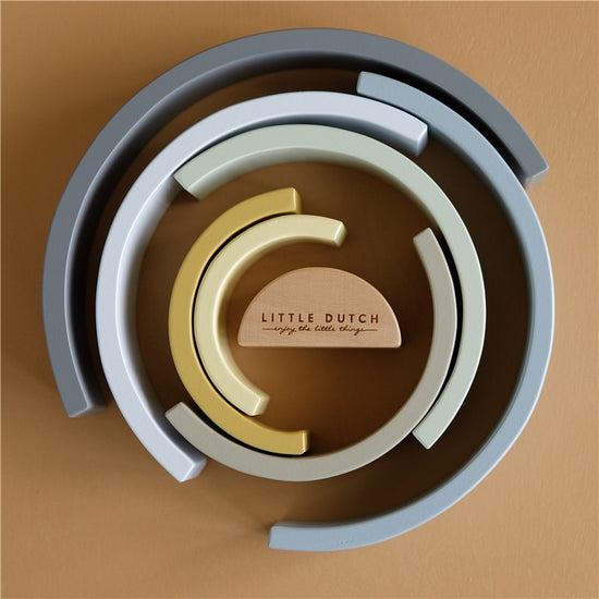 Este arco iris de madera es una torre apilable. Consta de 7 arcos que encajan entre sí, los niños pueden usar estas formas semicirculares para jugar y aprender al mismo tiempo. Pueden apilar los arcos o utilizar su imaginación para realizar todo tipo de creaciones, como un túnel de tren, una casa para muñecos o puentes para coches pequeños. ¡Hay infinitas posibilidades!