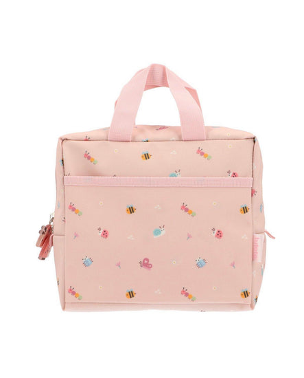 Tiene 2 asas cortas, para fácil transporte, y un bolsillito exterior donde puedes guardar cubiertos o pequeños objetos que necesites tener más a mano, que se puede personalizar con el nombre.