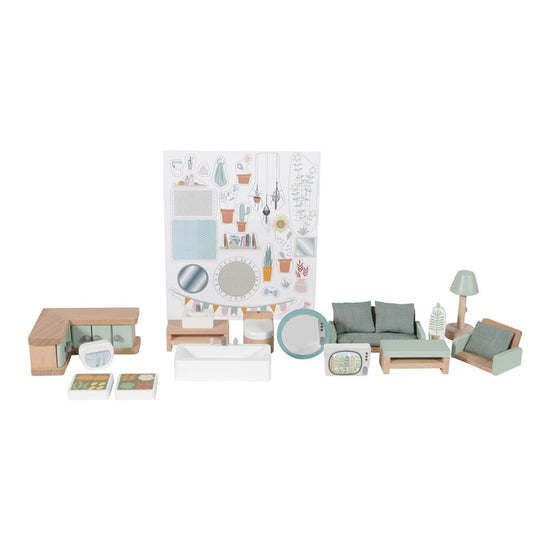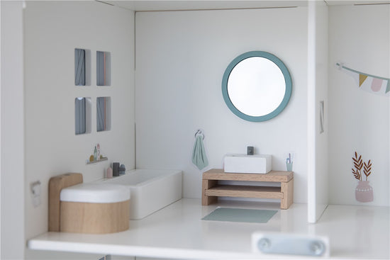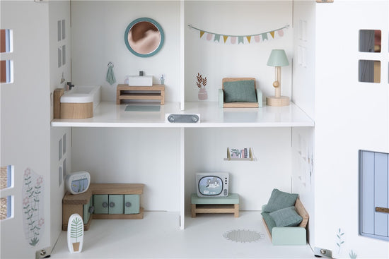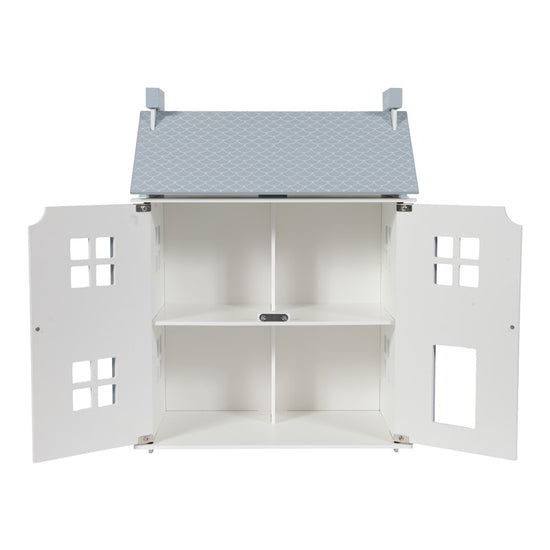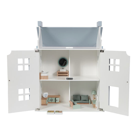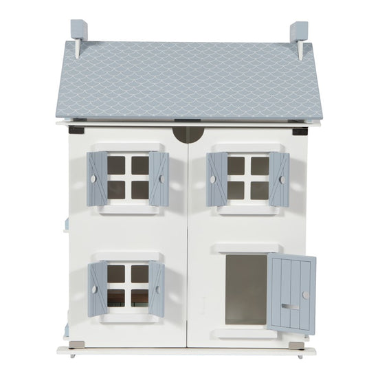 Esta clásica casa de muñecas garantiza horas de diversión. El robusto marco de madera tiene lindos postigos azules y un techo azul que se puede quitar para mostrar el ático. Y hay más: ¡el panel del techo es en realidad un jardín! La casa viene con 19 muebles y accesorios.
