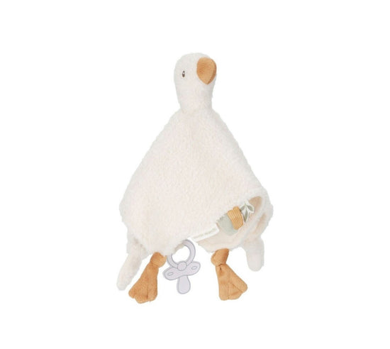 La dulce oca invita a abrazos sin fin, mientras que sus pequeñas manos pueden explorar la suave tela.
