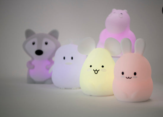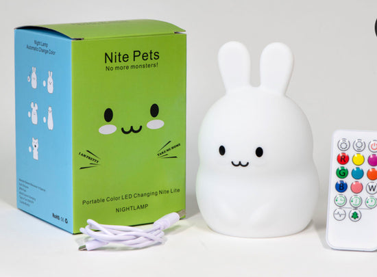 La lámpara quitamiedos de silicona en forma de conejito de la marca Lights 4 Kids es perfecta para acompañar a los niños durante la noche. Está fabricada en silicona 100% lavable y tiene un tamaño compacto (14 cm x 9 cm x 10 cm).