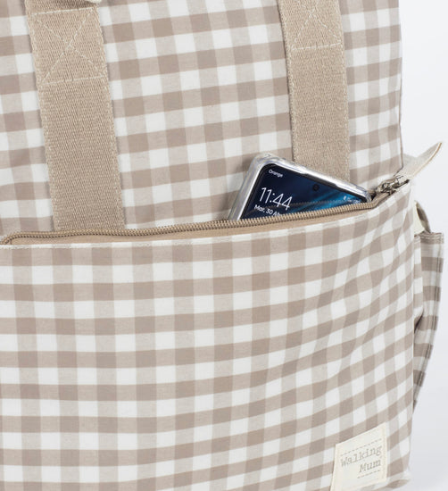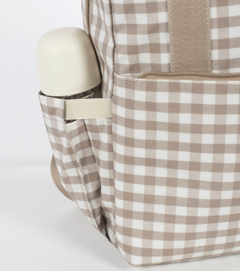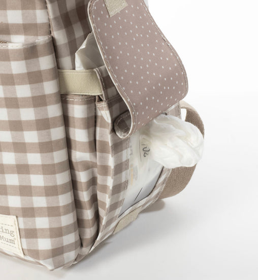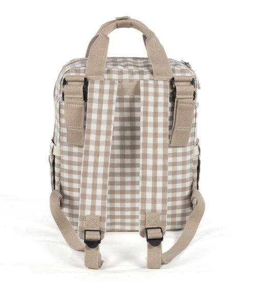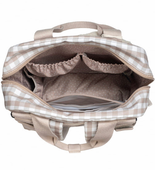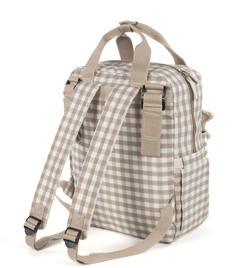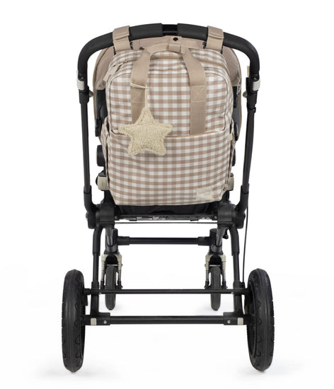 Una bolsa canastilla y mochila al mismo tiempo, muy moderna y urbana, ideal para llevar tus cosas y las de tu bebé, con mucho estilo, a todos sus paseos. La bolsa Caetana Sand de cuadros beige para silla de paseo es un modelo multifunción muy ligero, resistente y de gran capacidad para llevar todo lo necesario en el paseo del bebe. Incluye un charm en forma de estrella donde puedes bordar el nombre de tu bebé para personalizar el bolso. Su esquema ofrece múltiples bolsillos exteriores e interiores para poder tener todo ordenado y a mano.