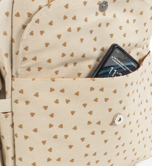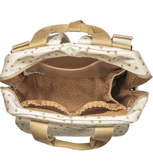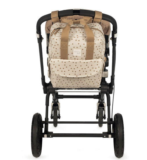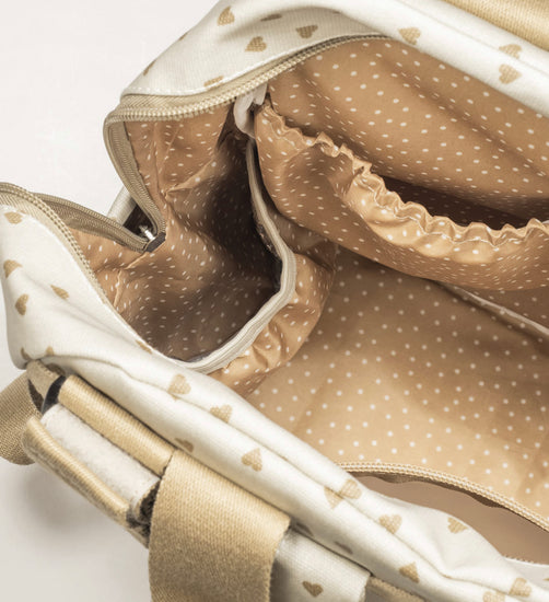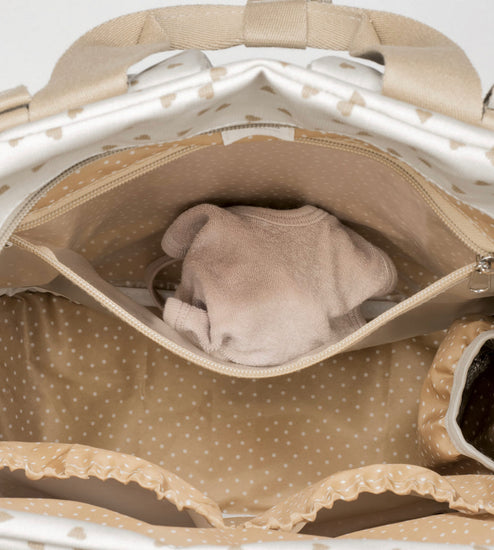 Una bolsa canastilla y mochila al mismo tiempo, muy moderna y urbana, ideal para llevar tus cosas y las de tu bebé, con mucho estilo, a todos sus paseos. La bolsa Poppy Canela con corazones para silla de paseo es un modelo multifunción muy ligero, resistente y de gran capacidad para llevar todo lo necesario en el paseo del bebe. Su esquema ofrece múltiples bolsillos exteriores e interiores para poder tener todo ordenado y a mano. Tiene bolsillos para guardar los biberones y mantenerlos seguros, elásticos para colocar cubiertos, para las toallitas húmedas, también tiene un funda para la botella de agua y otros más. Incluye un cambiador a juego con el bolso de maternidad y un bolsillo plastificado para almacenar la ropa mojada y aislar la humedad del resto de la mochila. El bolso incluye 2 asas cortas ajustables que facilitan la colocación en cualquier modelo de silla de paseo, asas de mano y correas acolchadas para colgar en los hombros hacia la espalda, sin generar molestias por el peso. Gran calidad y mucho estilo. Fabricada en un material resistente y de fácil limpieza. Walking Mum protege a tu bebé utilizando los mejores tejidos, libres de colorantes azoicos y sustancias nocivas para la salud. Nuestra colección Walking Mum guarda toda la calidad de la marca Pasito a Pasito pero con un particular sello de estilo urbano y moderno que no pasa desapercibido, para vestir diferente los paseos con tu bebé. Las bolsas de maternidad de esta línea son más sport y prácticas, especialmente pensadas en mamás y papás modernos que aprecian los diseños más actuales y en tendencia sin dejar de lado la calidad y la funcionalidad de los accesorios que complementan y hacen más cómodos todos los paseos con sus bebés.