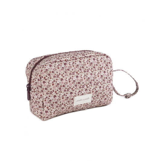 El neceser de bebé Cherry Flores elaborado en loneta de algodón 100% con un delicado estampado de flores, es un bolso pequeño especialmente pensado para llevar todos los productos de aseo de nuestro bebé al salir de casa.