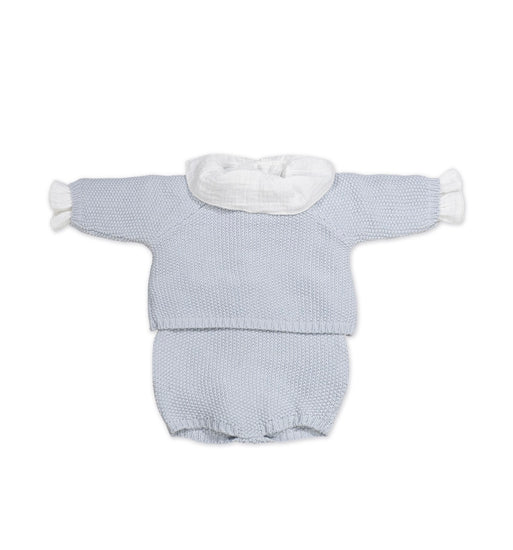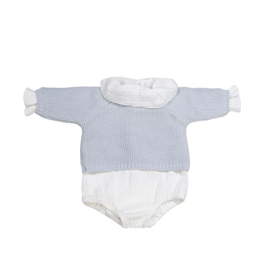 Pasito a Pasito trae el conjunto ideal para la primera puesta de tu bebé, formado por un jersey, una ranita en tricot y un body interior de bambula lisa.